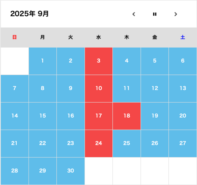 カレンダーの赤いところはクローズになりますのでご注意ください