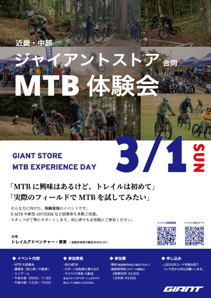 <概要> イベント名 近畿・中部ジャイアントストア合同MTB体験会 開催日 2026年3月1日(日) 開催地 トレイルアドベンチャー・栗東 内容 ・MTB試乗会(GIANT/Liv) ・レベル別講習会(初心者/中級者) ・ミニゲーム <お申込み方法> Googleフォームからお申込みください。 < イベント参加ご予約はこちらから> ※定員に達し次第、募集終了とさせていただきます。 ・募集期限:2026年2月10日(火)~ 2月26日(木) ・申込方法: Googleフォーム(先着順) ・定員: 午前・午後ともに各20名 ----------------------------------------- <試乗車ラインナップ> 実際のトレイルでGIANT/LivのMTBを体感できます。 ・ANTHEM ADVANCED SL 3 (S) ・ANTHEM ADVANCED SL 3 (M) ・REIGN ADVANCED 2 (S) 2024 ・REIGN 1 (S) ・TRANCE X ADVANCED 2 (M) ・TALON 1 (S) ・FAITH ・FAITH 24 ・STP 26 ・STP 24 ・STP 20 ・STANCE E+ (S) ・STANCE E+ (M) ・TALON E+ (S) ・Liv INTRIGUE LT ADV PRO 1 (XS) 2023 ・Liv EMBOLDEN 2 (XS) ----------------------------------------- <ジャイアントストア合同MTB体験イベント試乗会について> SCOTTのMTBを3月1日(日) 9:00〜15:00開催 ・イベント参加には専用ページからの手続きが必要です。 ・試乗会の参加は無料です ・トレイル利用料金(¥2500/2h)は別途必要となります ・試乗会へのご参加はトレイル利用時間内に含まれますので ご了承ください ・当施設予約ページより事前の予約(ご利用手続き)に ご協力ください ・当日の天候により中止となる場合がございます ご理解のほどよろしくお願いいたします ---------------------------------------