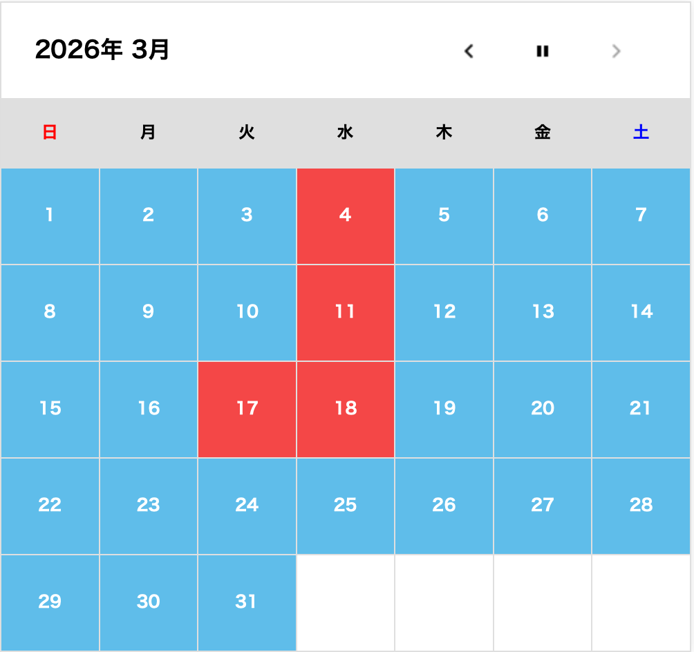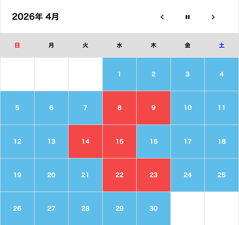 《3月4月の営業について》 ●営業時間 9:00〜17:00(最終受付〜15:00) ●定休日 水曜日 大型連休や春休み期間は休まず営業! カレンダーの赤いところはクローズになりますのでご注意ください -------------------------------------------------------